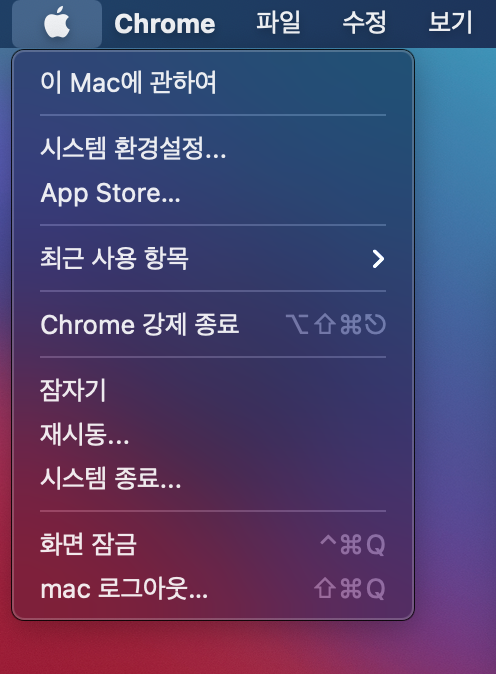 1. 맥북 좌측 상단에 사과 버튼을 누릅니다.