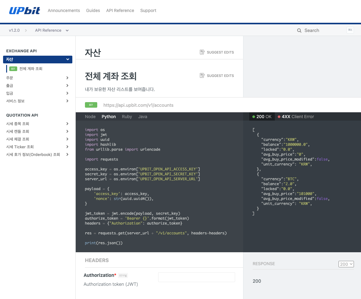 그리고, Upbit OpenAPI 가이드가 정말 잘 만들어져 있다는 것을 알게 되었다.
