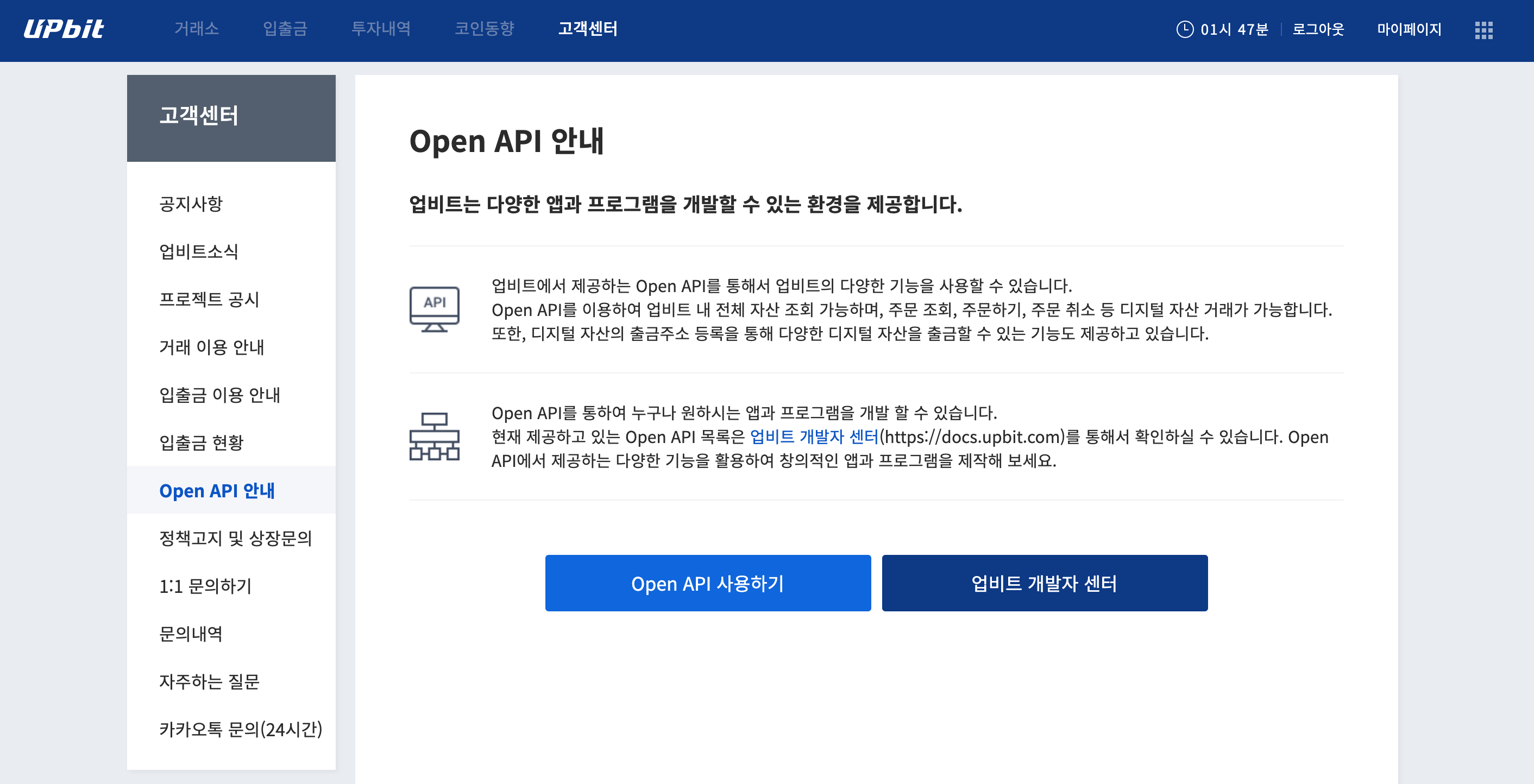 업비트 개발자 센터로 가봅니다.