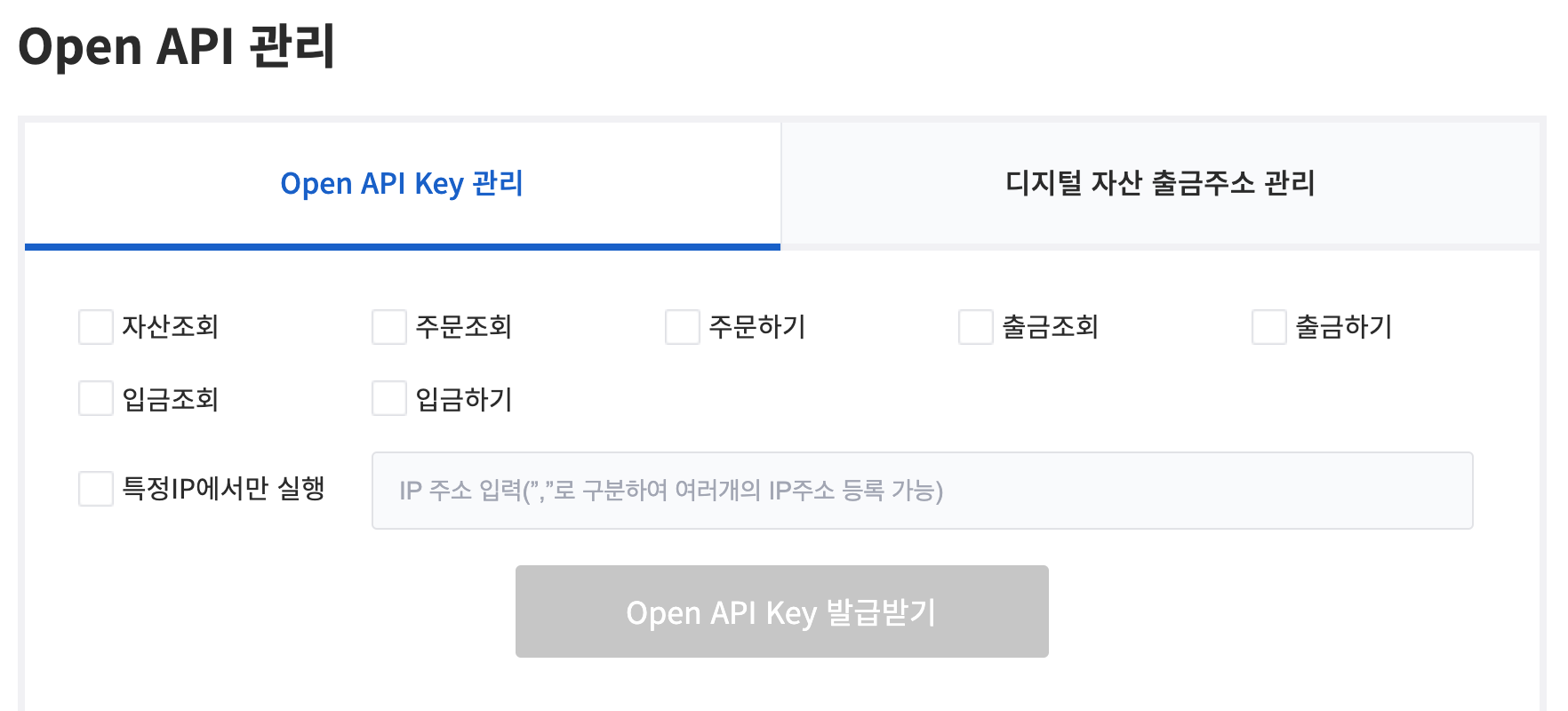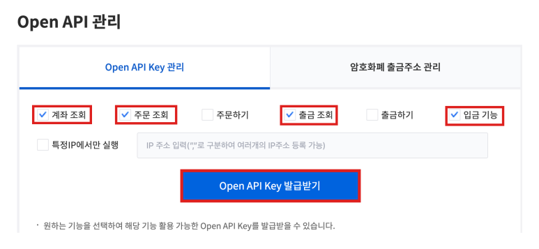 (봇으로 거래를 하려면 "주문하기", "출금하기" 까지 다 선택하고 IP를 입력해야함. 두가지 선택 안하면 IP입력 안함)