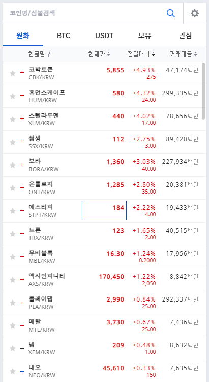 업비트의 코인들 입니다. 각 코인들을 조회하면 아래와 같이 코인 정보를 볼 수 있습니다.