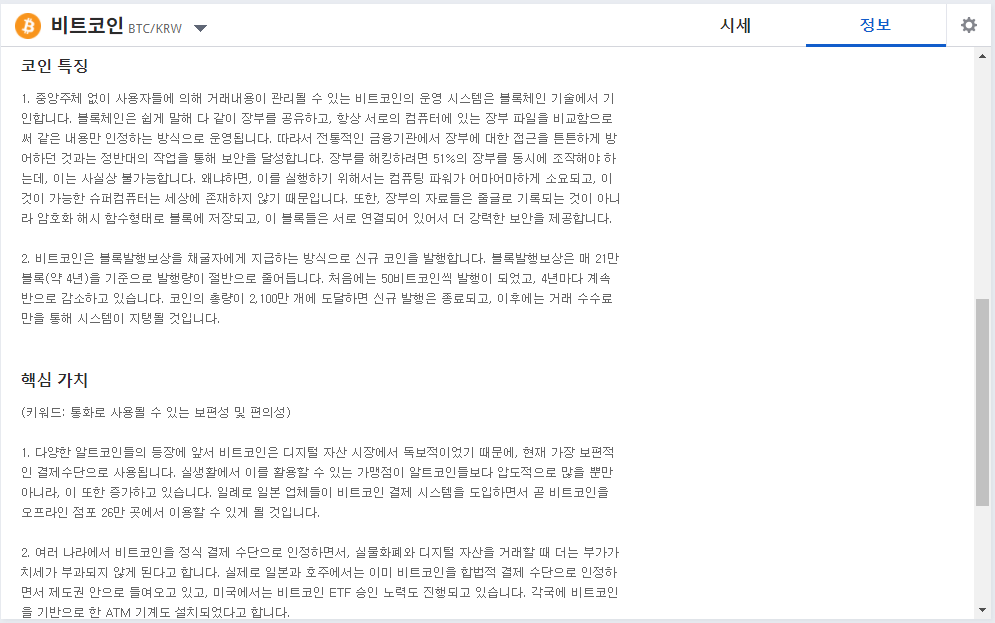 코인 정보란을 보면 코인 소개, 코인의 특징, 핵심 가치 등이 적혀 있습니다.