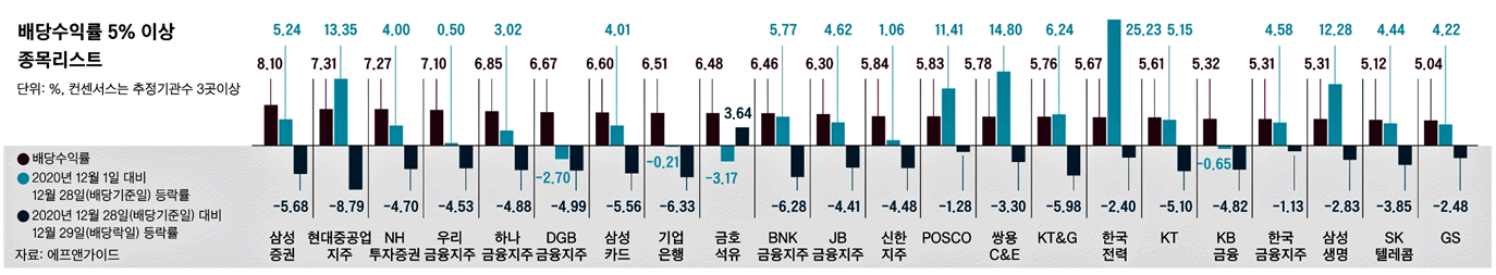 FN가이드에서 정리한 고배당 종목리스트와 작년 배당락일 대비 등락률 차트 입니다.
