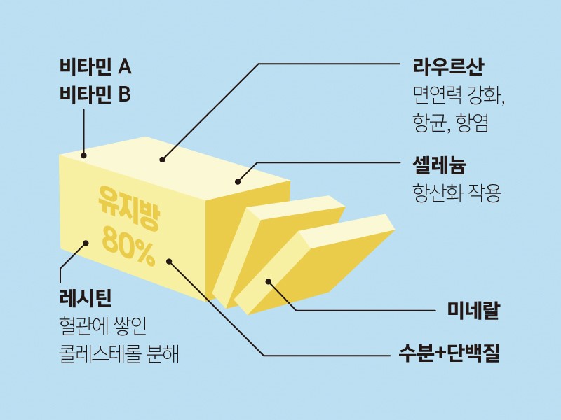 버터에는 비타민 A, D, 라우르산, 셀레늄 등 영양소가 많으므로 맛도, 건강도 챙길 수 있는 식품이다. 좋은 버터를 선택하여 맛과 영양을 모두 챙기기를 바라며 이번 포스팅을 마친다.