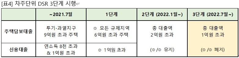 - 2022년 7월부터 적용되는 3단계에서는 1억원만 초과해도 차주단위 DSR규제가 적용 됩니다.