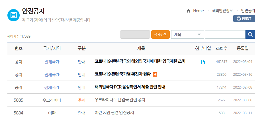 외교부 홈페이지에 해외안전여행 공지를 들어가면