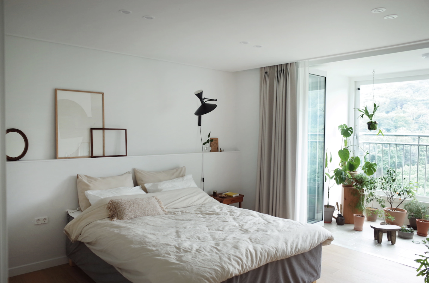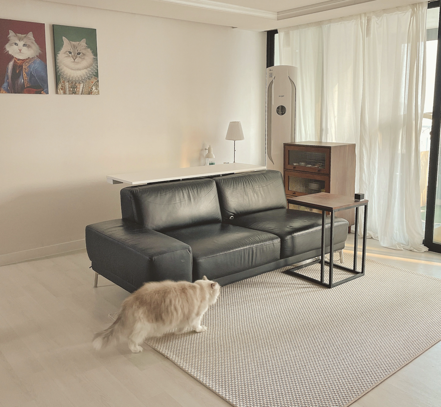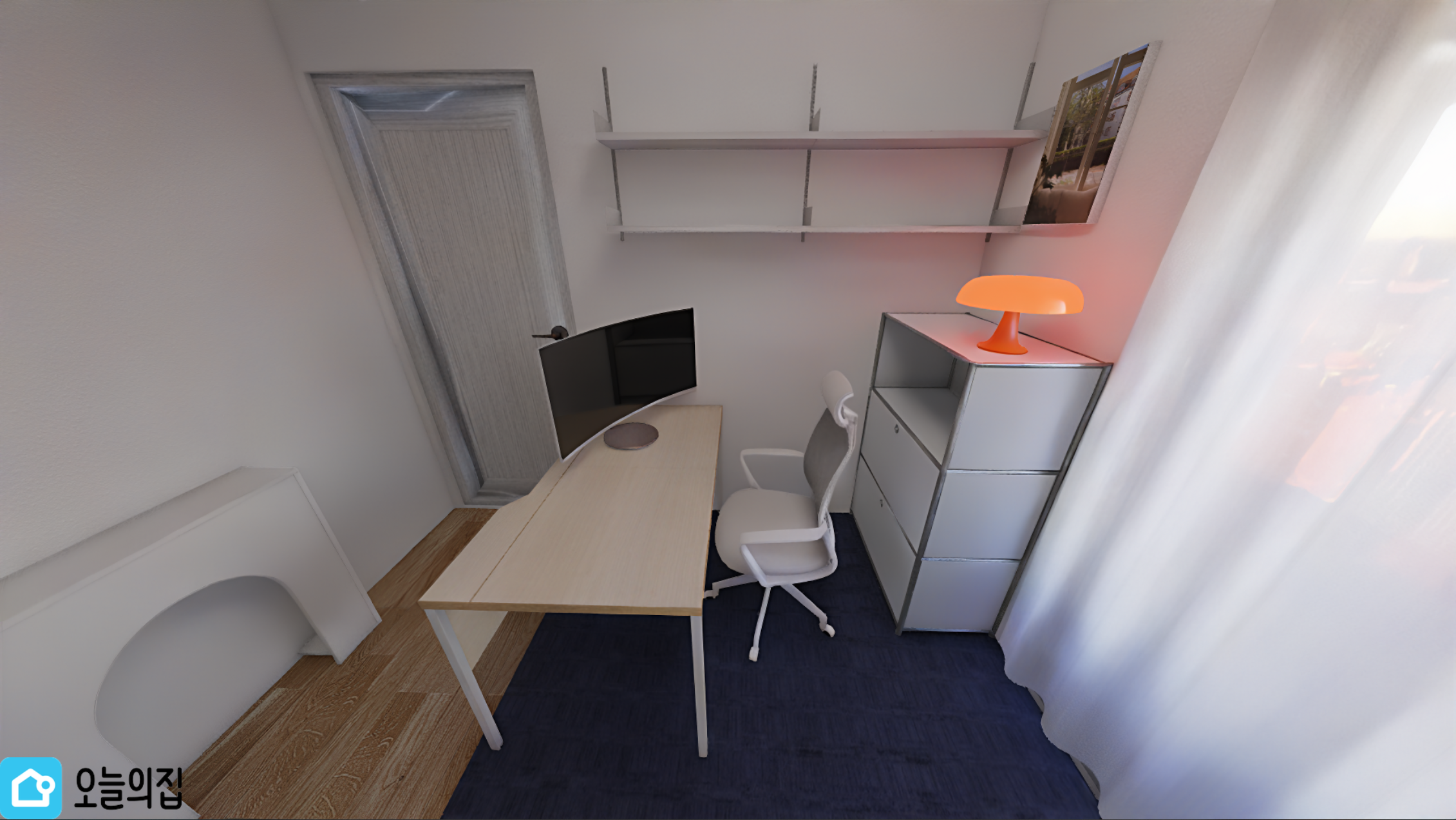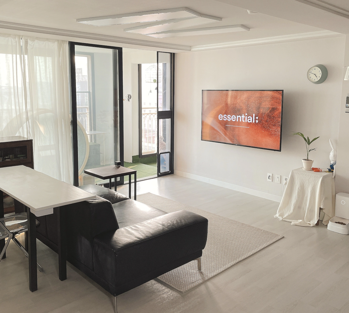 베란다로 이어지는 문은 화이트 커튼으로 가려주었고, 레어로우 벽선반 상단엔 책 + 장식 오브제 + 식물을 놓으면 좋을 것 같다.
