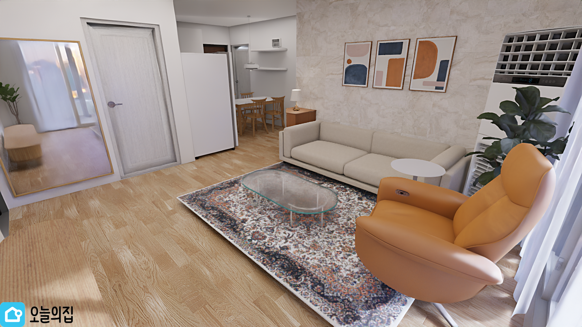 거실엔 소파와 리클라이너를 라운지 형식으로 배치해봤다. 리클라이너가 엄청 커보이긴하는데, 편안한 휴식공간이 될 수 있을듯.