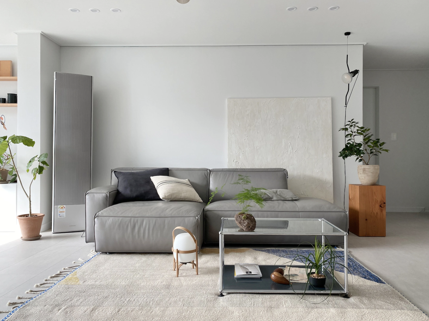 소파 우측엔 코너장 형태의 사이드 테이블과 탁상 조명을 배치해 보았다.