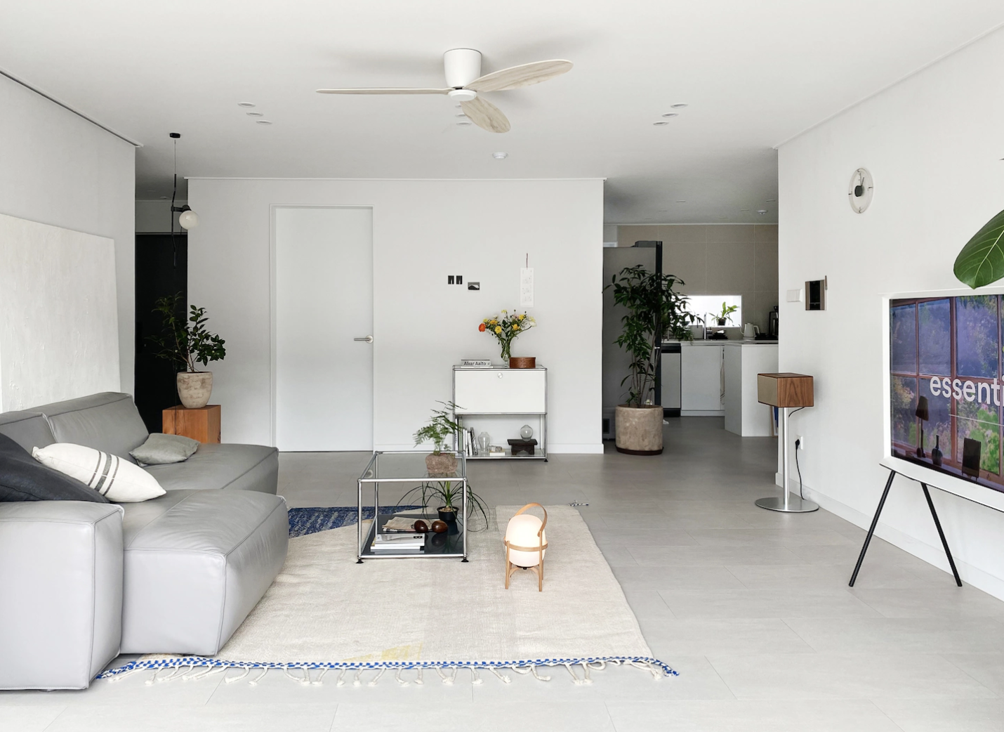 티비 좌측엔 식물들을 놓을 수 있는 2-3단 선반을 배치해도 좋을 것 같다.