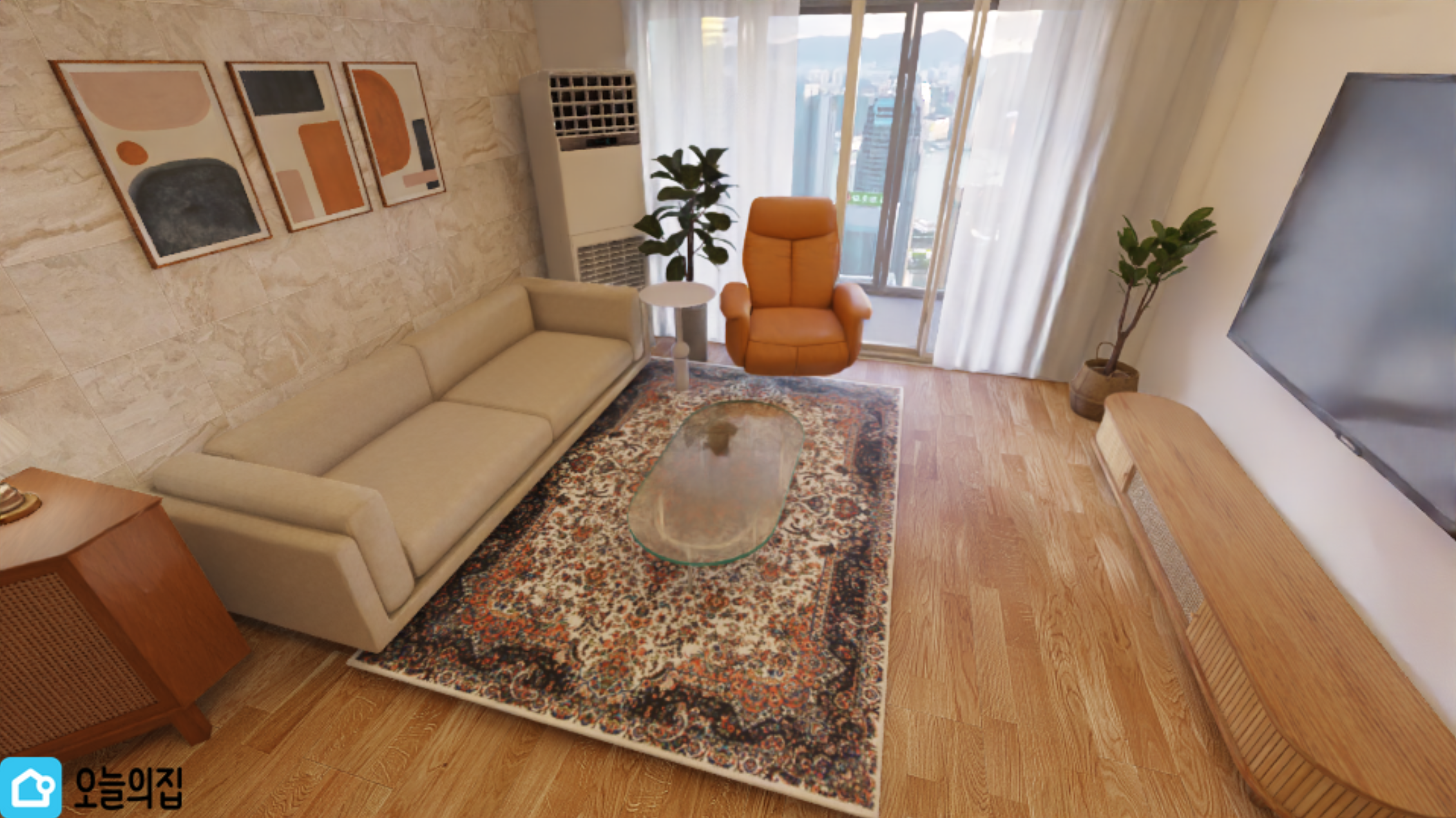 거실 티비는 85", 티비장은 낮은 우드톤에 동글동글한 디자인.