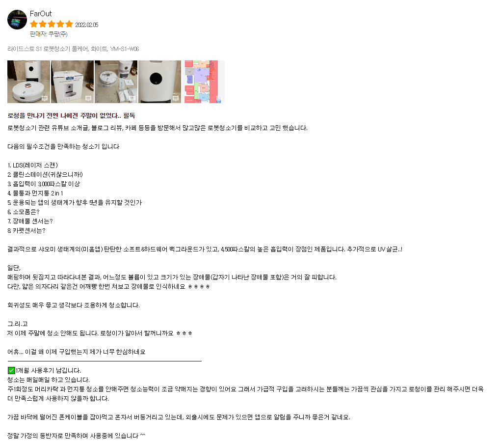 저희는 흡입력을 중요시하므로 샤오미 Lydsto S1 (라이드스토라고 읽습니다.)과 씽크웨이, 엠지텍이 최종 후보가 되었는데 마성의 로보락에 눈길이 한번 더갑니다. 하지만 가격에서 포기.
