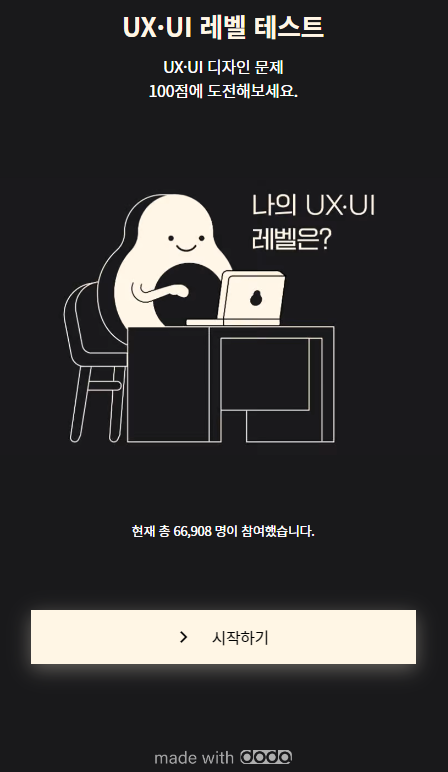 오늘 잠깐 그로스 해킹, 유입 분석 등의 마케팅에 대해서 살펴보던 중, UI/UX 레벨 테스트로 연결되게 되었다. 이런건 못참는 나는 또 테스트를 시작하는데, 이 테스트의 UI/UX가 심상치 않다. 컬러나 일러스트도 귀여운데, 적당한 작동감이 예사롭지 않다. 즐겁게 테스트를 완료하고 100점을 맞았다.