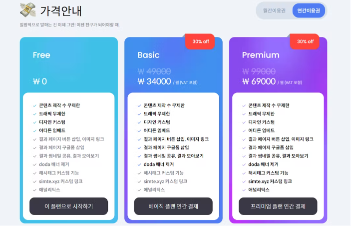 유료플랜도 알차게 잘 꾸민 것 같다. 무료 고객도 얼마든지 디자인을 커스텀해서 테스트를 할 수 있도록하여 유입, 컨텐츠 재생산을 늘릴 수 있고, 연 34000원이면 결과 페이지에 버튼, 이미지 링크까지 달 수 있었다. 아까 했던 테스트가 왜 구매링크로 연결이 안되었고, doda 배너가 있었는지 알게 되었다. (아보카도 책방 마케팅 담당님, 34000원 결제하시고 링크 거세요 제발..!)