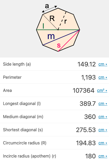 구글링으로 octagon calculator를 검색해주고, m = 360을 입력해주면 된다.