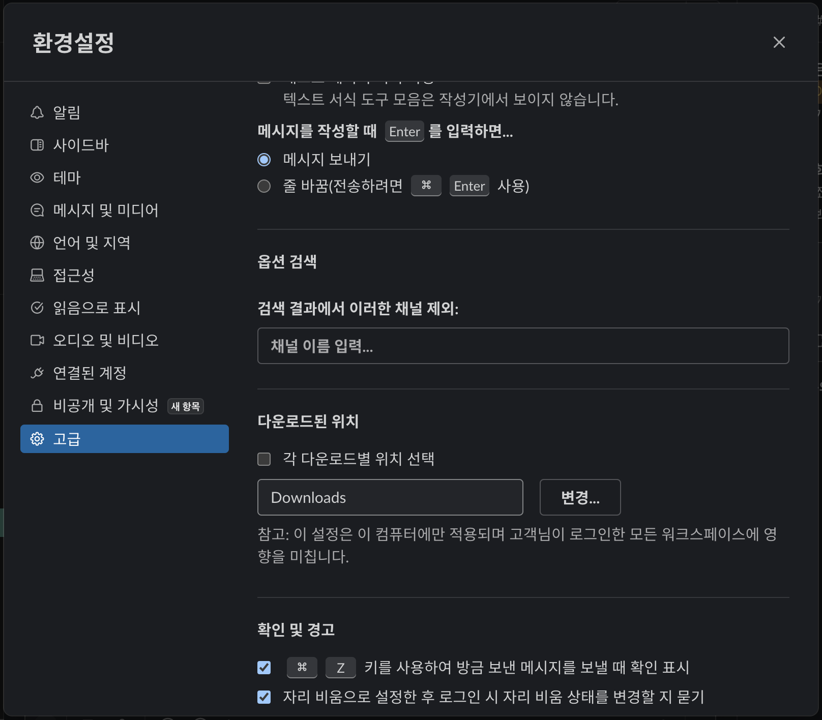 환경설정 > 고급 > 다운로드된 위치 로 간다.