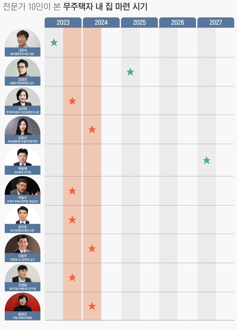 전문가 10인이 본 무주택자 내 집 마련 시기를 분석한 사진을 퍼왔다.