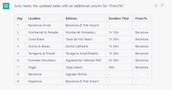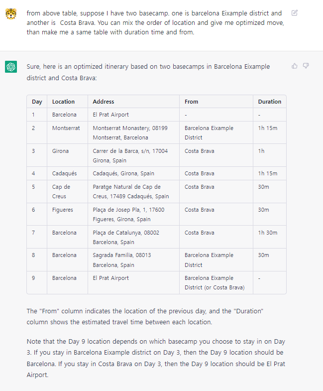 질문 : 베이스캠프를 두개로 하겠어. 하나는 바르셀로나, 하나는 코스타 브라바. 여행 순서를 가장 효율적으로 최적화해주고 소요시간과 이동 경로를 다시 정리해줘.