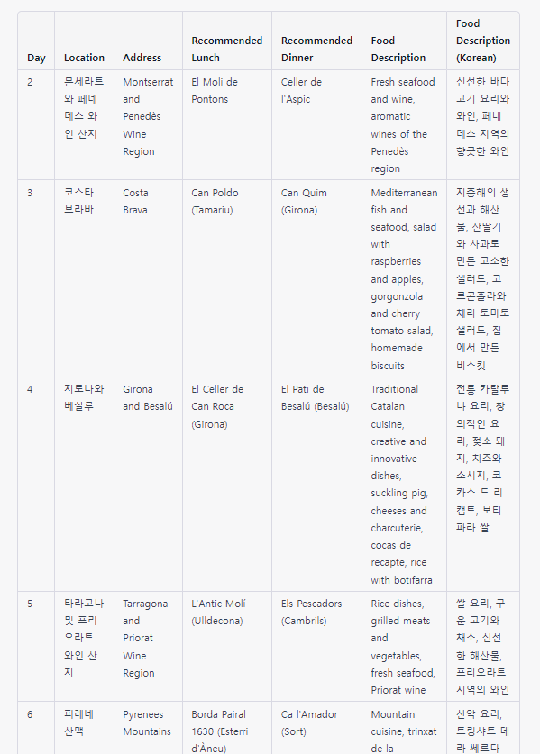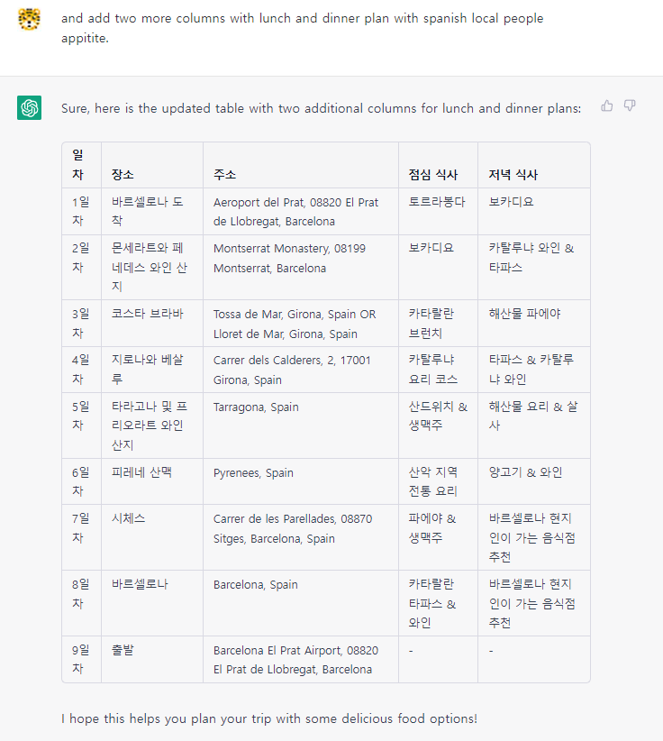 질문 : 표에 두개의 컬럼을 추가하는데, 점심과 저녁 플랜을 스페인 현지 로컬 취향으로 추가해줘.