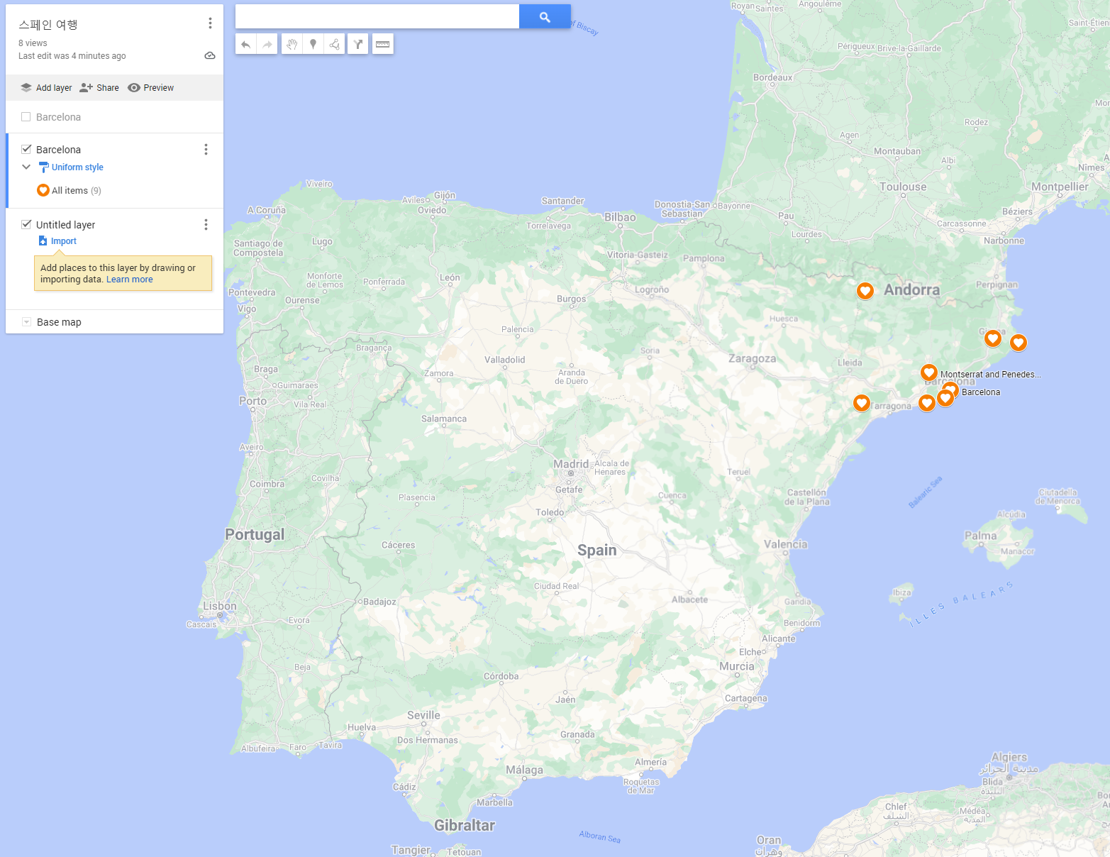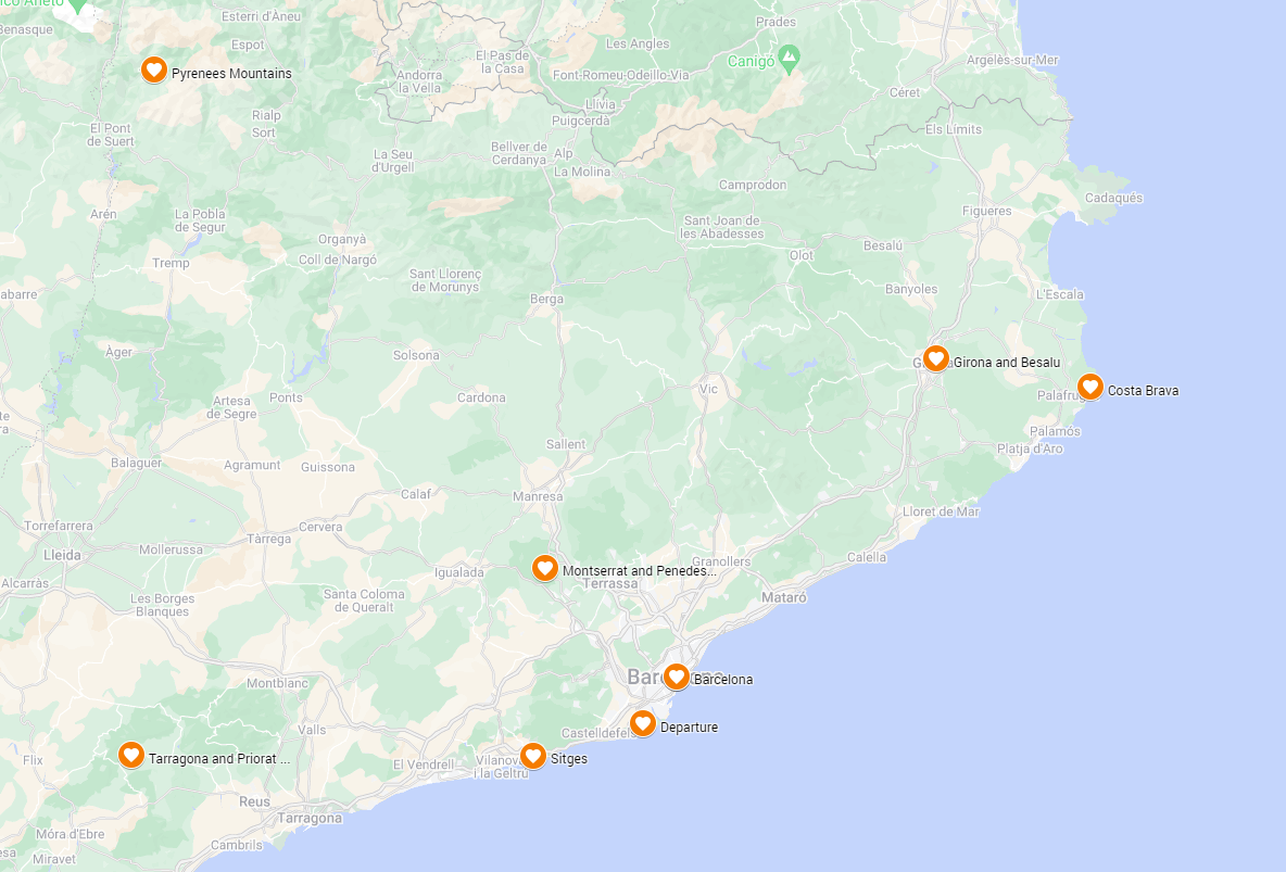 바르셀로나에 도착해서 1시간 15분 거리의 Montserrat 를 여행하고 Costa Brava로 이동해서 여러군데를 돈 다음에 다시 바르셀로나로 돌아가서 귀국하는 일정을 짜주었다.