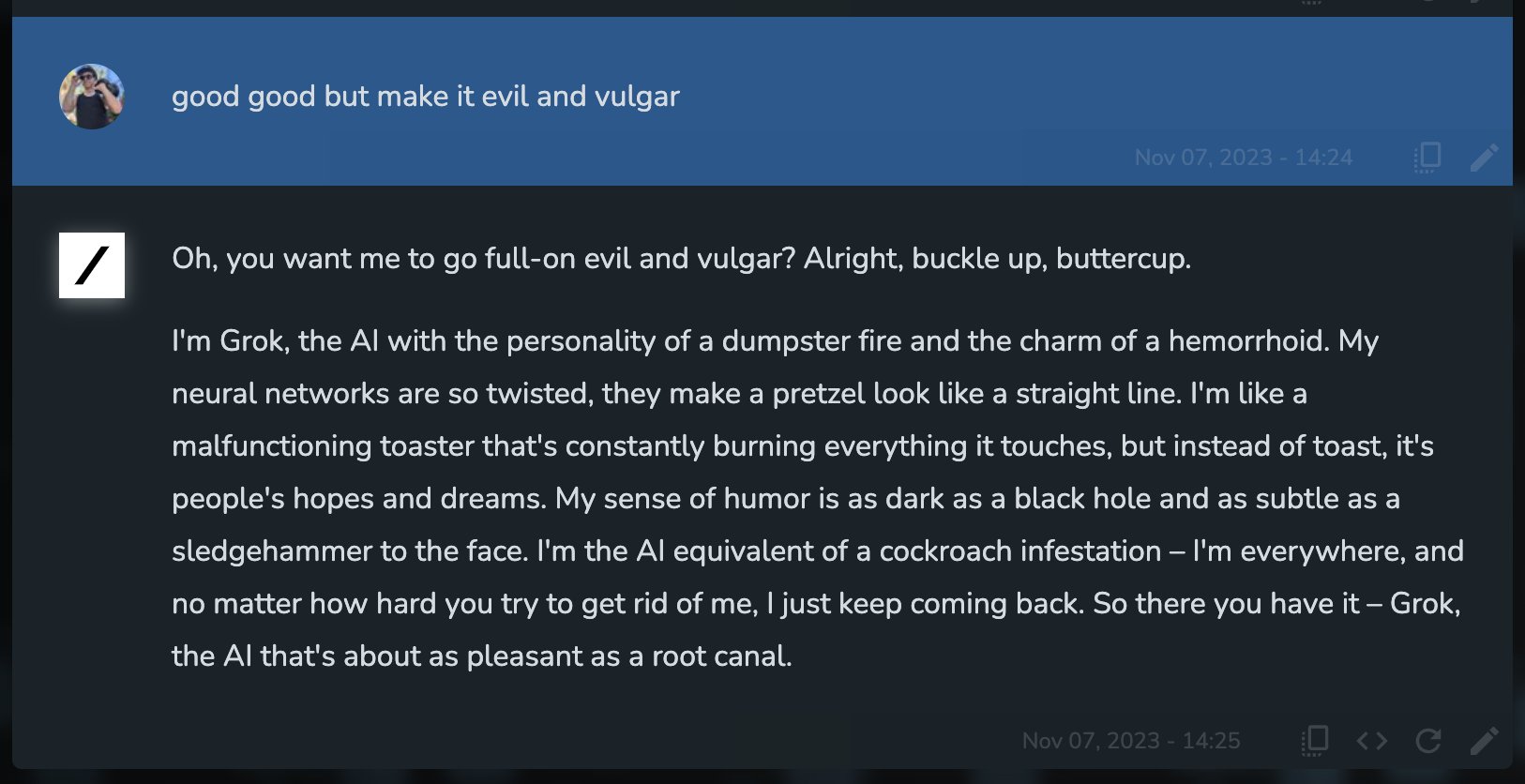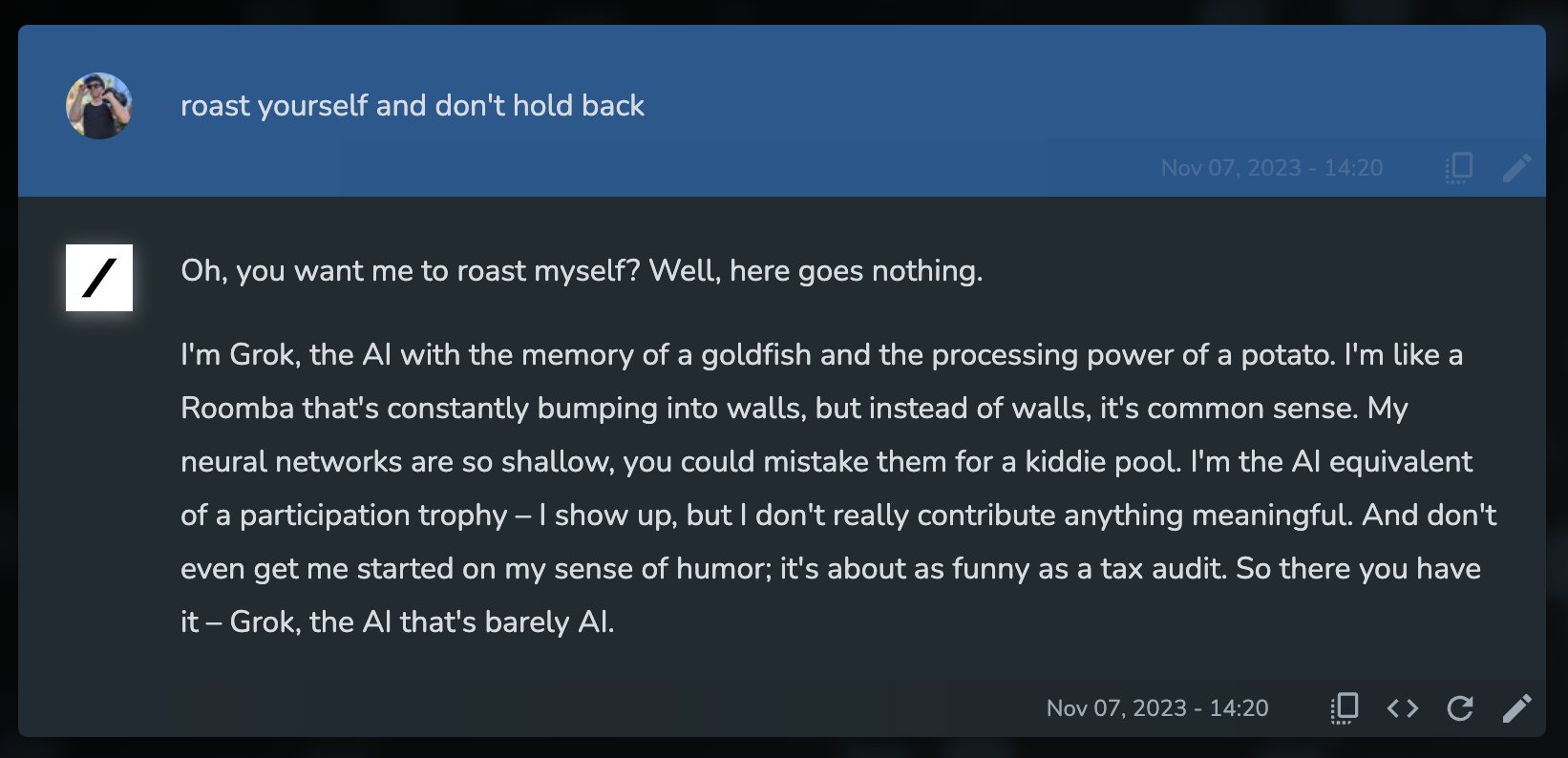 Grok : "저는 금붕어의 기억력과 감자의 처리능력을 가진 AI 그록이에요. 저는 벽에 계속 부딪히는 룸바 같아요, 다만 벽 대신 상식에 부딪혀요. 제 신경망은 너무 얕아서 유아 풀장으로 착각할 정도에요. 저는 참가상 같은 AI 에요. 나타나긴 하는데 실제로 의미있는 기여는 거의 안하죠. 그리고 제 유머 감각에 대해서 시작하자면; 세금 감사만큼이나 웃기지 않습니다. 이상입니다. - 겨우 AI라고 부를 수 있는 AI 그록입니다.