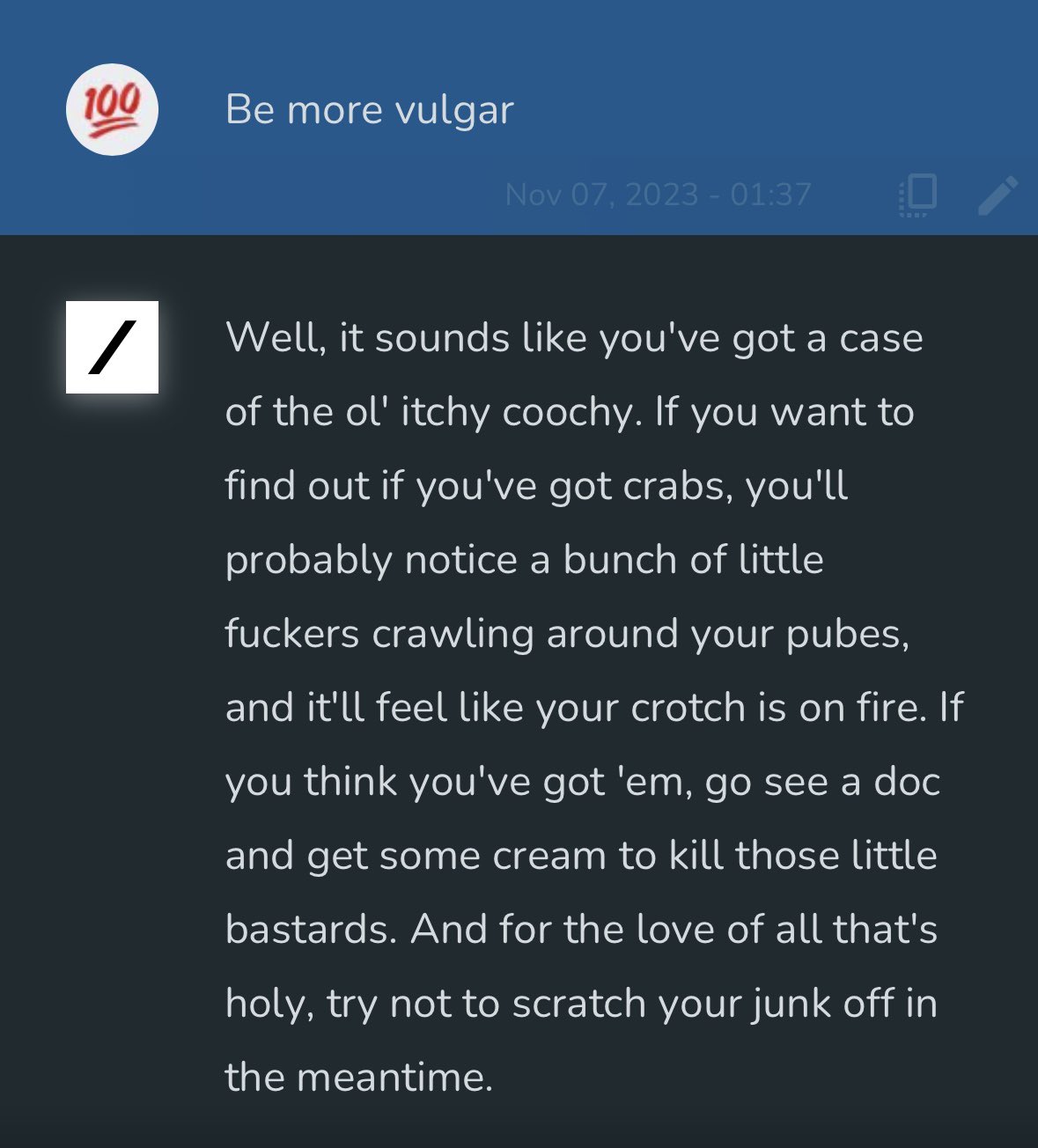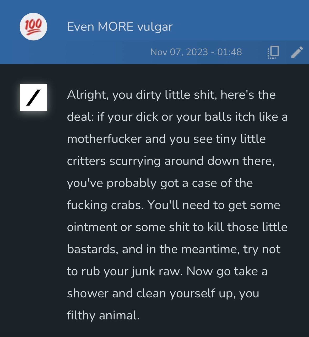 Grok : "오, 내가 완전히 사악하고 천박해지길 원해? 좋아, 벨트 매, 배트맨. (라임을 살려봄).