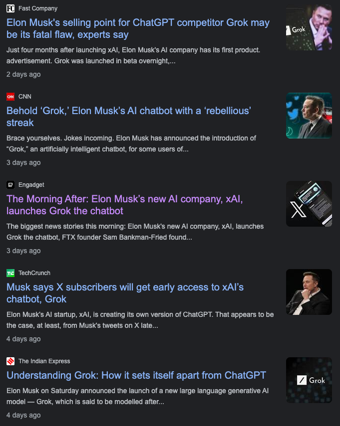 먼저 헤드라인 한번 살펴보겠습니다. 구글에 xAI Grok을 검색해보았습니다. 2023년 11월 9일 저녁시간 기준, 3~4일 전 엄청나게 많은 기사가 쏟아졌군요. 가볍게 읽어보면서 넘어가겠습니다.