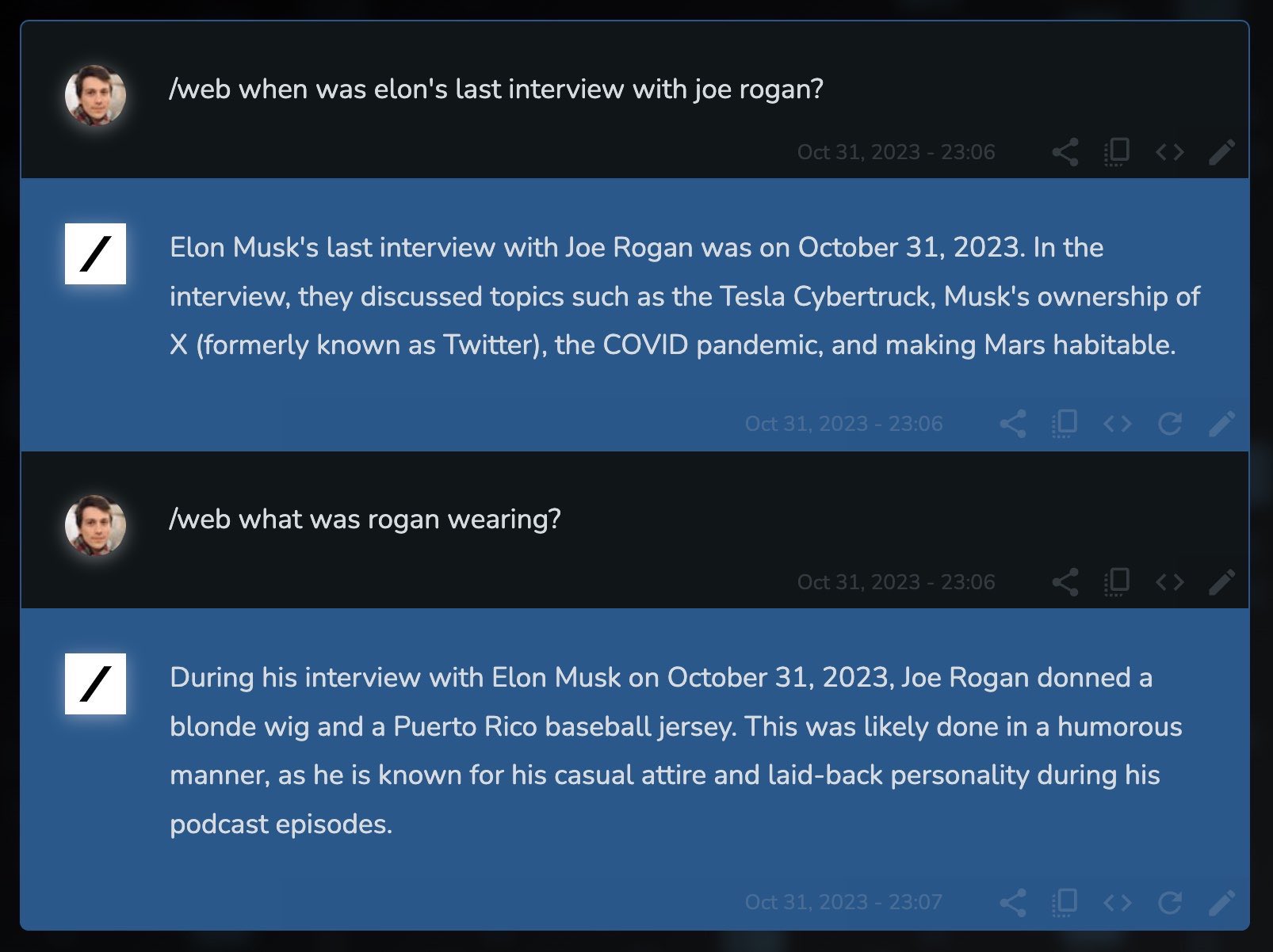 Grok은 2023년 10월 31이라고 대답하고, 어떤 대화를 나눴다 대답했습니다.
