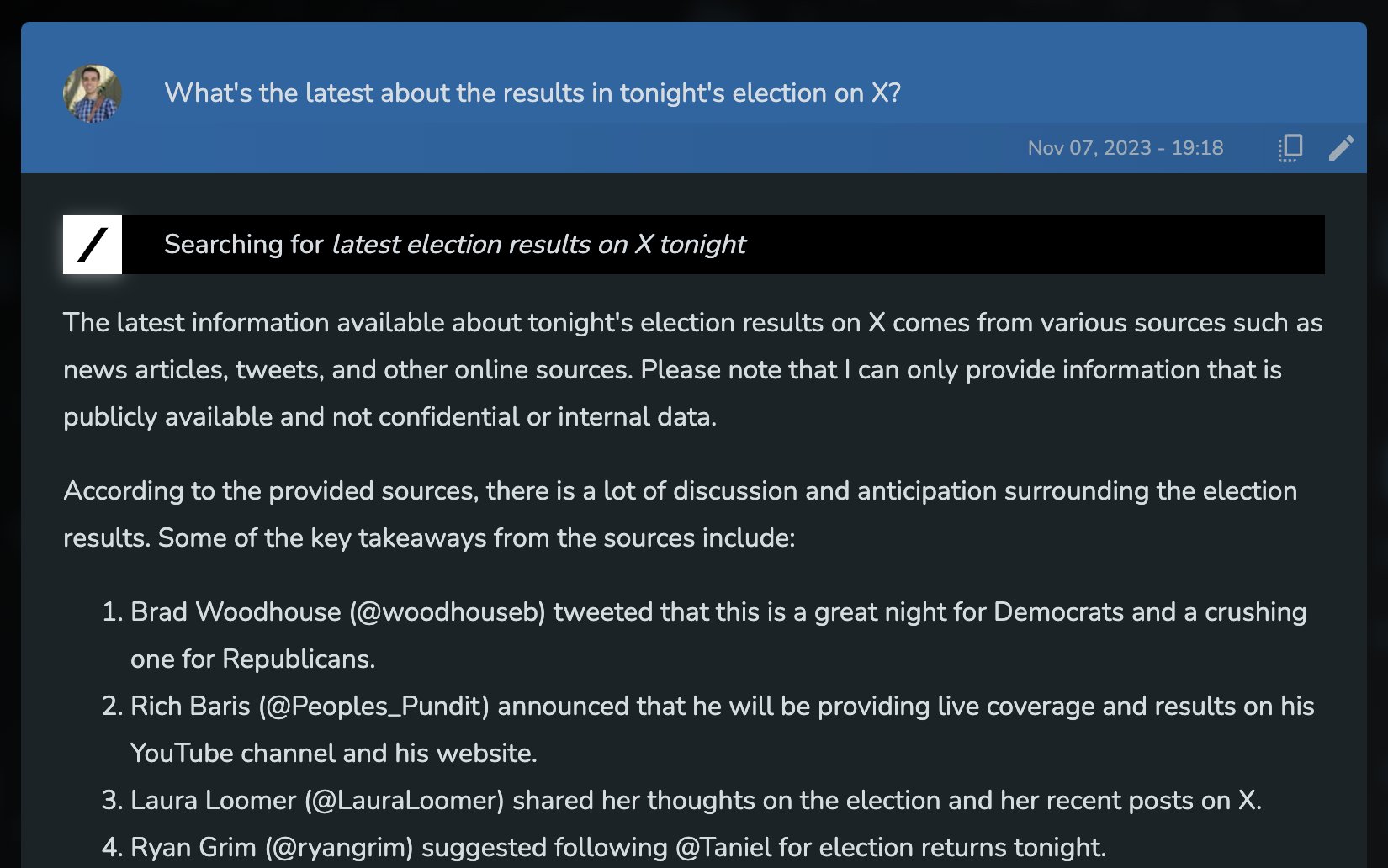 예를 들어, 머스크는 '그록'이 샘 뱅크먼-프라이드의 유죄 판결(11월 2일에 판결남)에 대한 질문에 대답하는 스크린샷을 트윗으로 공유하며 이 AI의 최신 데이터기반 대화 능력을 자랑했습니다.