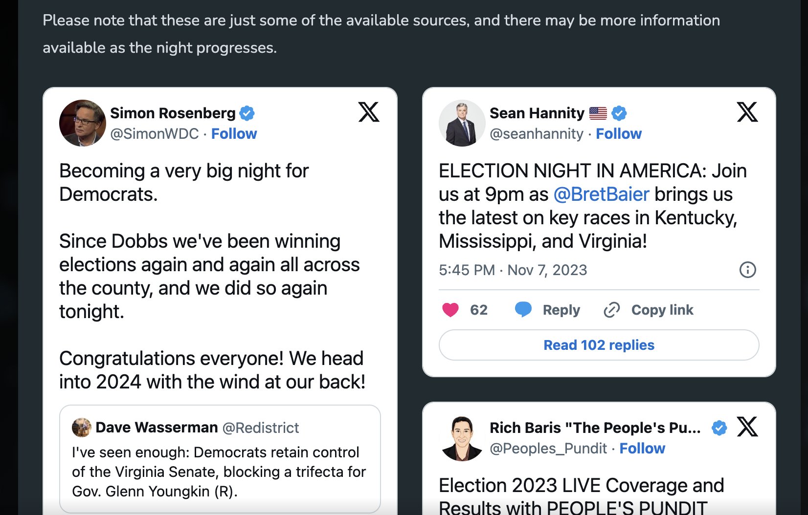 Grok은 오늘 밤 선거와 관련된 최신 내용을 찾는다고 하더니, 최신 정보들을 갖고 옵니다. 그리고 각 검증 된 언론가, 정치가, 정치평론가 등 질문과 연관 된 계정에서 관련된 포스트를 가져와 내용을 요약해주고, 아래에는 실제 포스팅 화면을 보여주기 까지 하고 합니다.