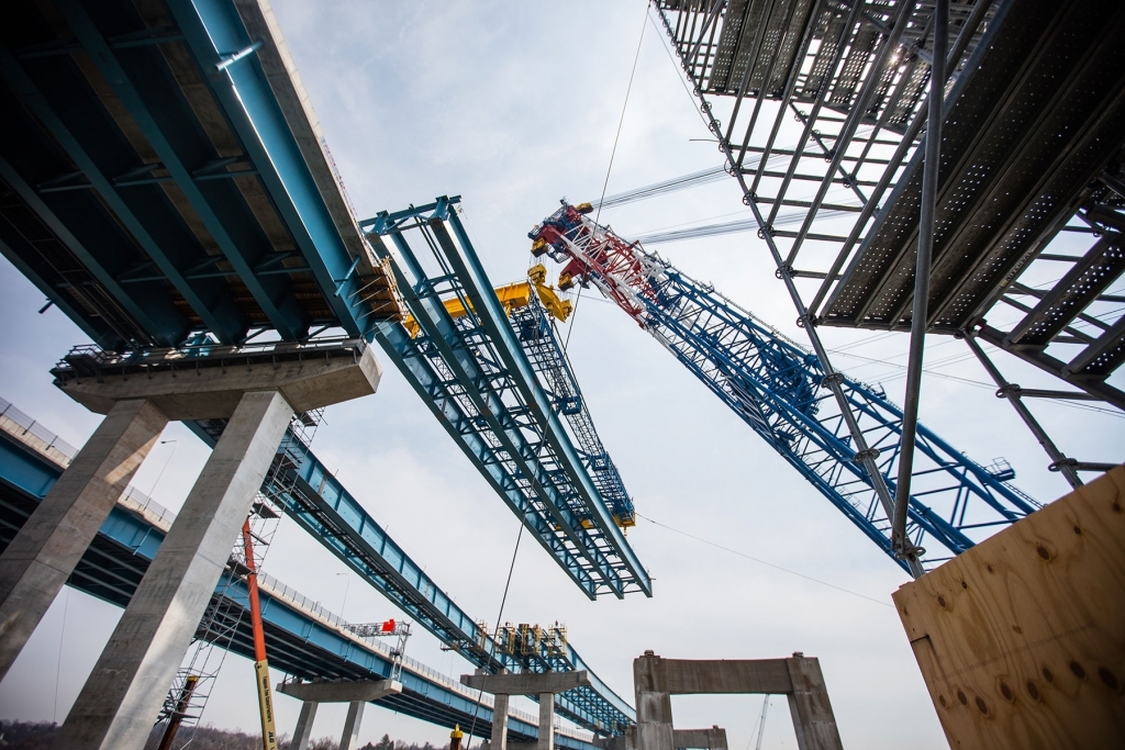 크레인과 기타 중장비를 사용하여 구조의 일부를 들어올리거나 위치를 조정하는 모습이 담겨 있습니다.