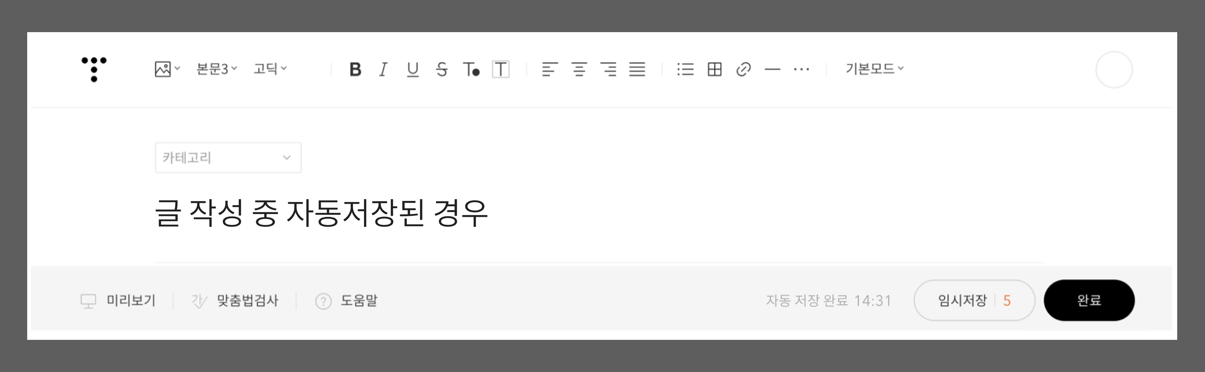 자동 저장이 실행되면 임시저장 옆에 자동 저장 완료 문구를 깜빡하며 나타내 주어 글쓴이를 안심시켜 준다.