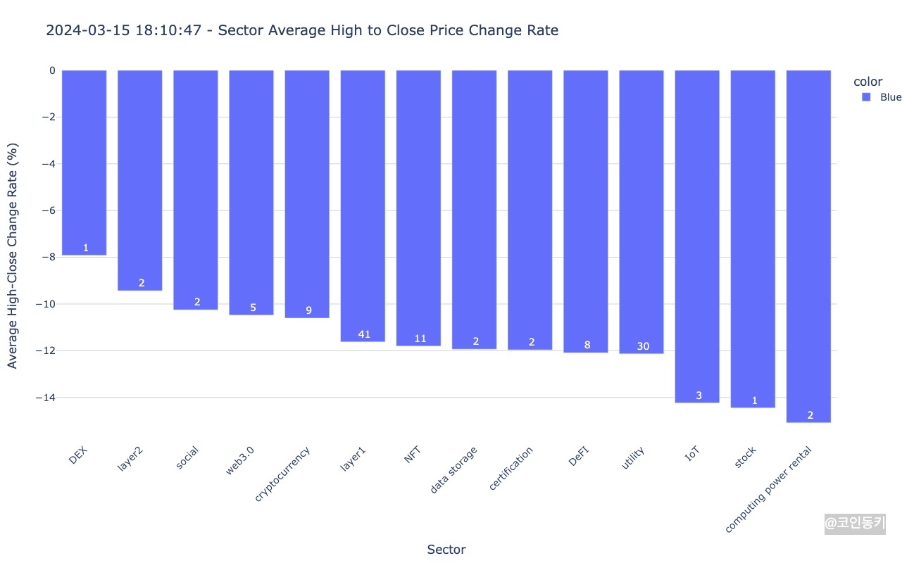 섹터별 하락률 입니다. 차트안에 숫자는 섹터에 포함된 코인 수인데요.
