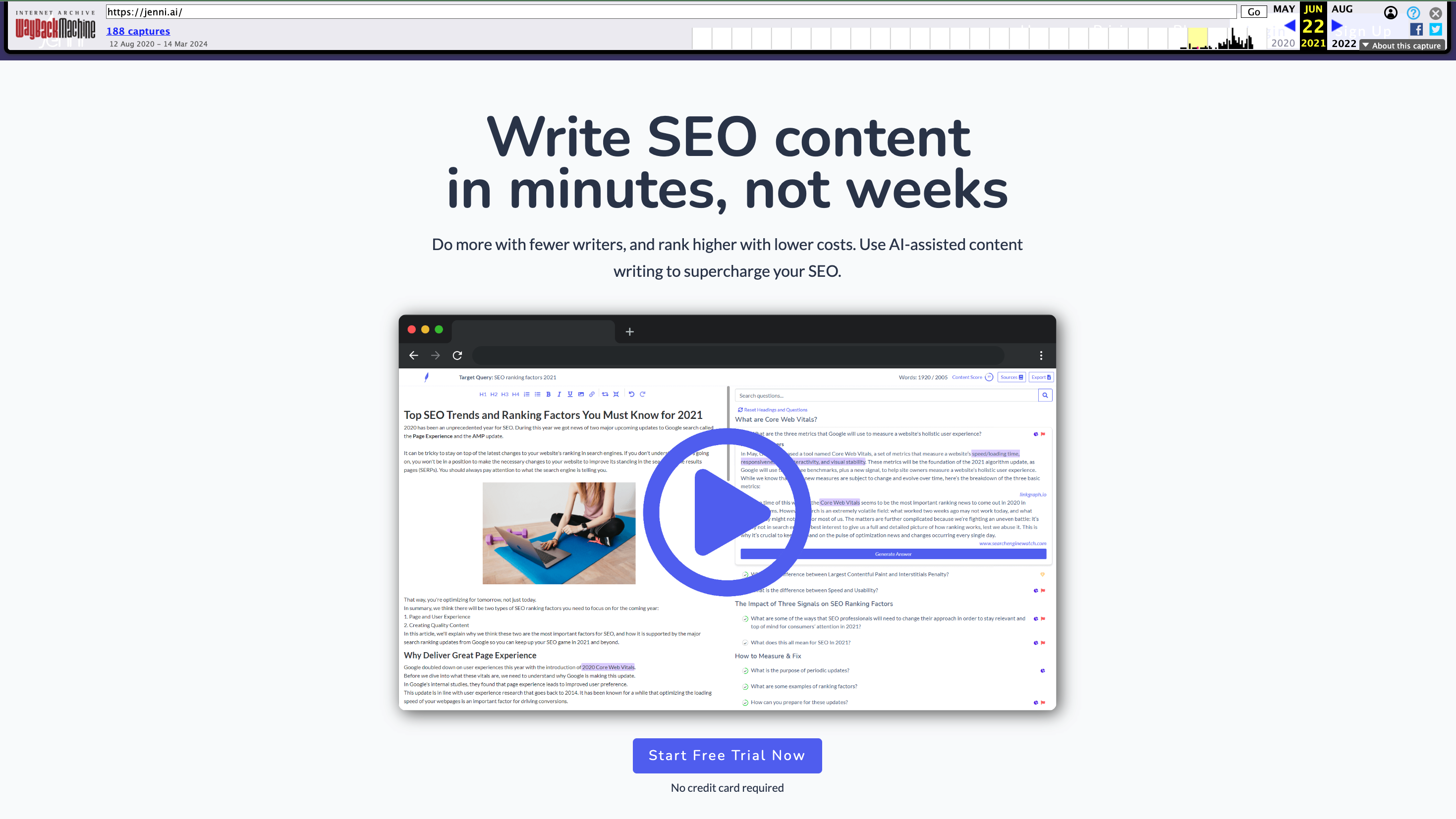 - 초기에는 SEO 최적화 글쓰기 도구로 시작했습니다. 검색 엔진에 최적화 된 글을 AI의 도움으로 써준다는 개념으로 기업 고객들을 대상으로 한 B2B 서비스였습니다.