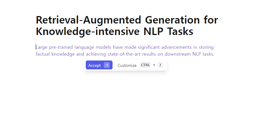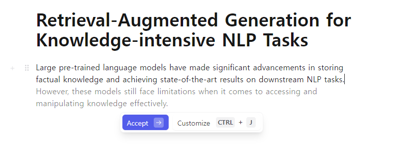 1. 특히 자동완성 기능을 통해 문장을 자연스럽게 이어갈 수 있고, ChatGPT에 갔다오는게 아닌 텍스트 에디터 위에서 AI와 협업하는 듯한 UX는 혁신적인 사용자 경험의 개선이라는 생각이 들었습니다.