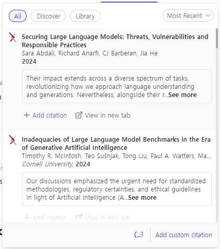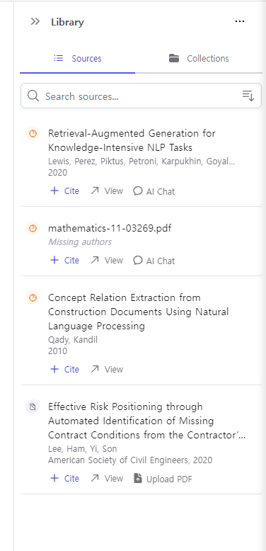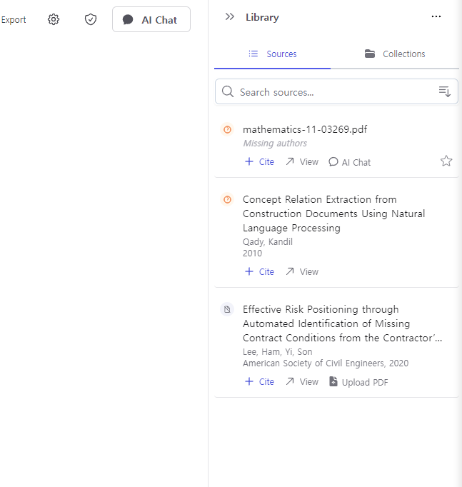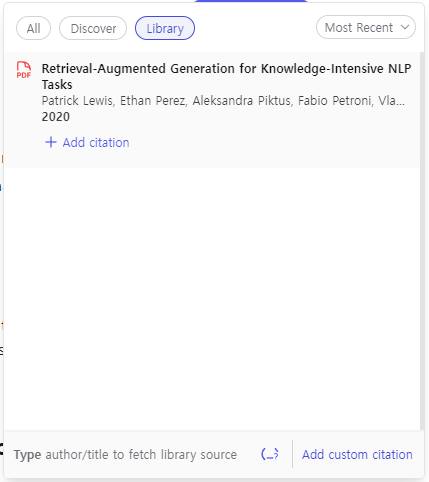 Cite를 클릭하니 아래와 같이 먼저 Library에 있는 제가 업로드했던 논문이 추천이 되네요.