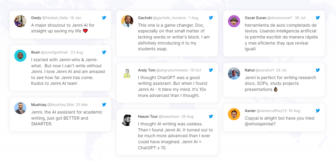 웹사이트에는 실제 사용자들의 다양한 후기도 게재되어 있습니다. 2백만 명 이상의 사용자들이 Jenni AI를 이용해와서, 글쓰기 속도와 효율성이 크게 향상되었다고 합니다.