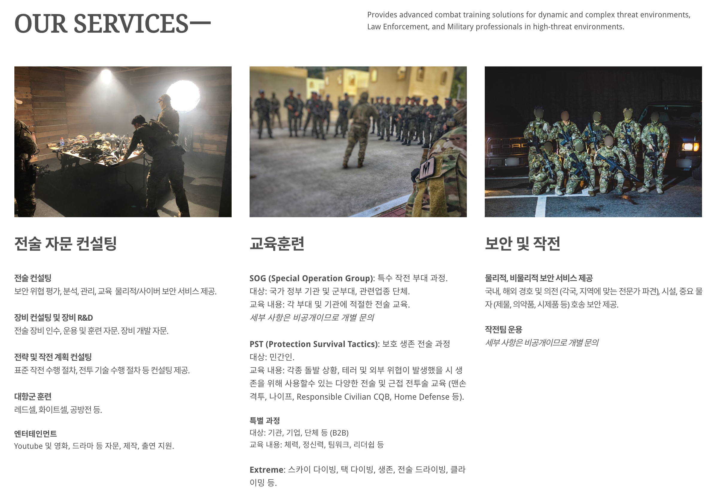 전술 자문 컨설팅에는 Youtube, 영화, 드라마 자문, 제작, 출연 지원도 포함되어 있으며, 보안 및 작전 서비스에는 물리적, 비물리적 국내, 해외 경호 및 의전도 지원하는 것으로 나와있다. 특수부대 베테랑 출신들이 모인 회사 답게 일반 업체에서는 다룰 수 없는 다양한 민간 군사 서비스를 제공하는 것을 알 수 있다.