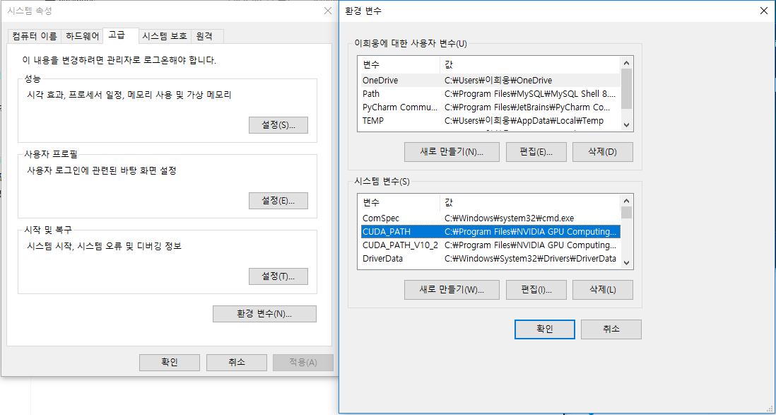 CUDA_PATH를 cuda설치 폴더/10.1 포함 설정