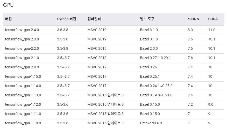 tensorflow 공식 document에 보면 tensorflow GPU 버전과 Python, cuDNN, CUDA 버전의 호환성을 확인해 볼 수 있다.